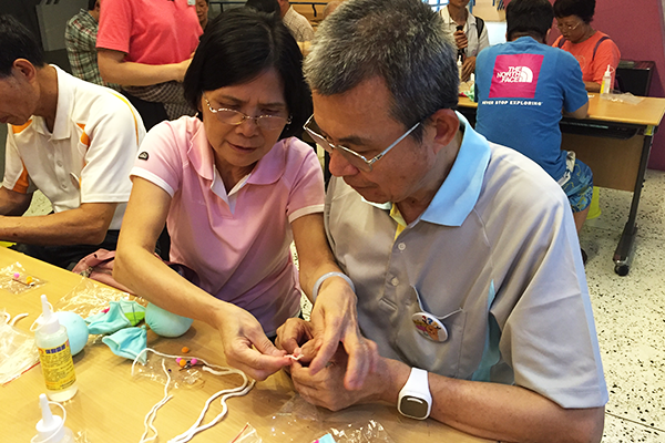 ▲失智者與家人共同參與主題活動,如手工藝、工藝課等。依其能力將活動步驟分解,並與家人共同完成活動,過程中除獲得成就外,也讓彼此可有正向共同互動的過程,增加家庭間凝聚力。