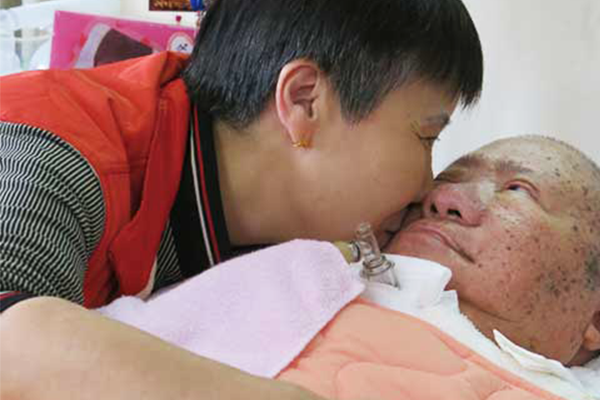 ▲漸凍人家屬親吻病友,協會透過提升病友醫療照顧,減輕病友家屬身心靈的負擔,進而增進病友及家屬間相互扶持與鼓勵。